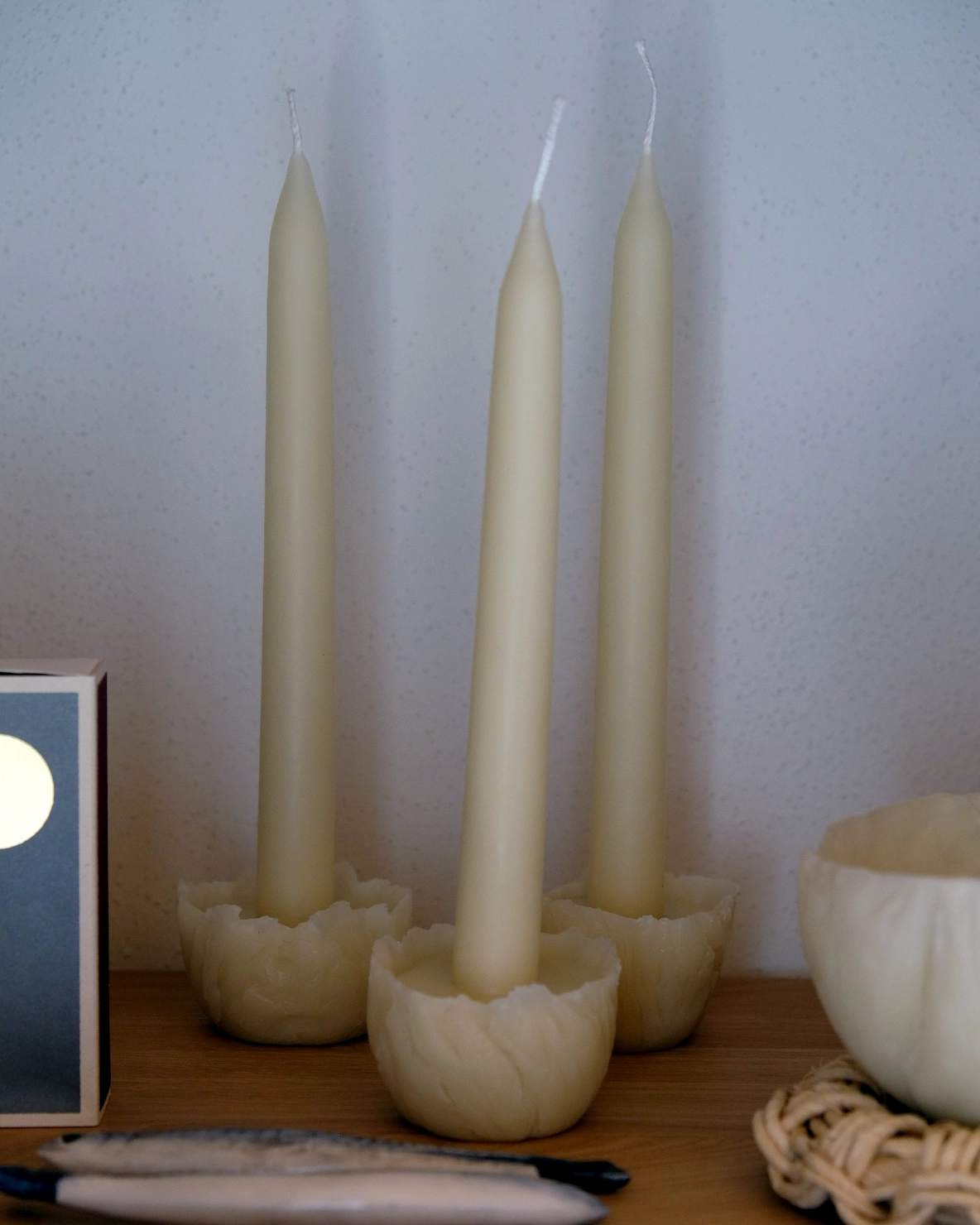 Sviečku Pēōny vyrábame z certifikovaného 100 % včelieho vosku pôvodnou technikou pomalého namáčania. Vrstvením vosku získava postupne na objeme, vďaka čomu ovplyvňujeme jej hrúbku aj výšku. Pēōny je navyše doplnená o ručne tvarovaný podstavec, vďaka čomu je samostojaca. Vhodná ja ako úžitková sviečka, ale aj ako solitérny dizajnový doplnok.